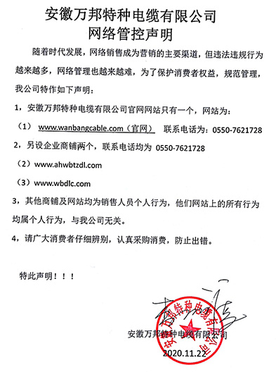 鄭重聲明:安徽萬邦特種電纜有限公司官方網站為:www_wanbangcable_com.sthhs.com,除此之外無任何子網站或合作網站,其余均為假冒偽劣。電話:0550-7621728 13485756353 地 址:安徽省天長市滁州高新技術產業開發區經四路29號